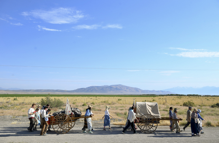 The women of the Henderson Nevada Lake Mead Stake pull their handcarts without the help of the men as they complete the Women's Pull on Wednesday, June 21, 2017 at the Mosida Handcart Trek Site near Elberta, Utah. The site brings youth, typically ages 14-18, in the Church of Jesus Christ of Latter-day Saints closer to their families, faith and also themselves through reenacting handcart experiences, like the first Mormon handcart pioneers that came to Salt Lake City from Iowa City beginning in 1856.